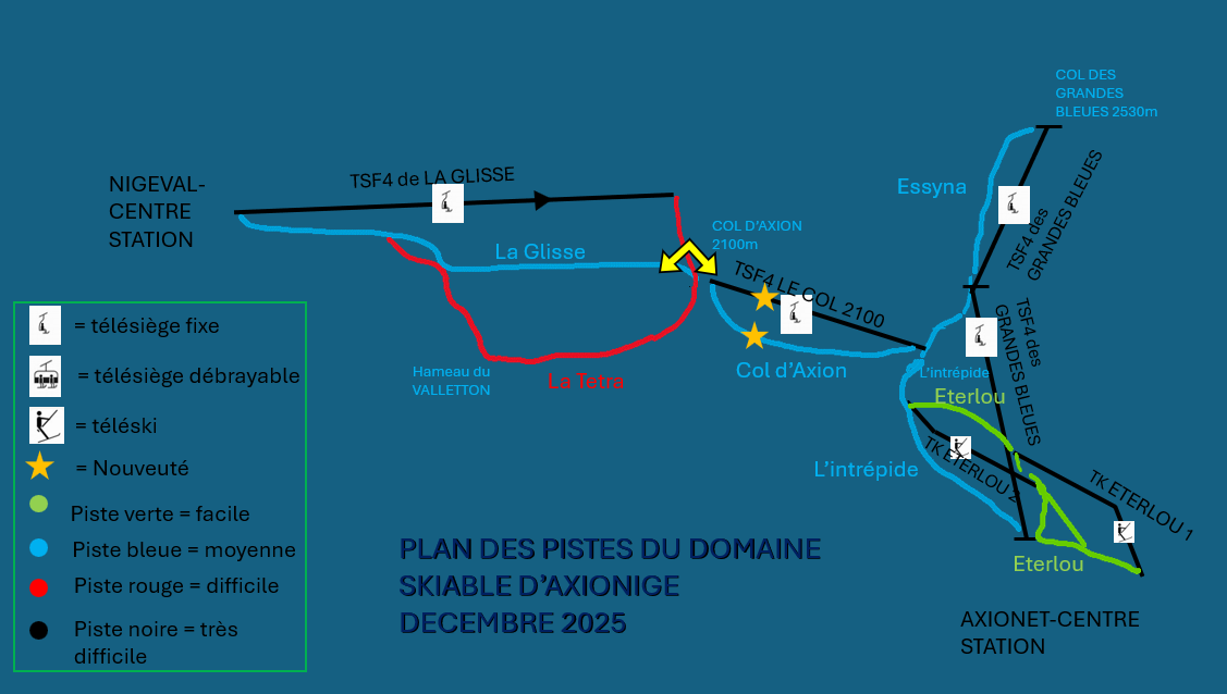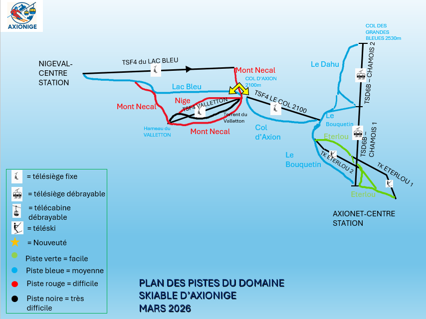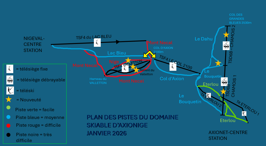 PROJETS A VENIR SUR LE DOMAINE SKIABLE D'AXIONIGE : Plan des pistes à terme Descriptif des projets : 1- TCD10C TRANS’ALPES 1 (Doppelmayr 10-MGD « UniG » ; 4500 p/h ; 6m/s ; FO) 2- TSD8BC ORSIERS (Poma TSD8 « Phoenix » ; 3950 p/h ; 5,1 m/s ; FO sf tapis), Desserte : 2.1- Crêtes ; (2.2 Marmottes)* 3- TSCD8BC10C LAC BLEU II (AO à faire) Desserte : 3.1 Lac Bleu (existant et agrandi de 2100 à 2300m pour le départ) ; (3.2 Zone Ludique)*. TSF4 DU NECAL (TSF4 LAC BLEU I renommé) (Poma TSF4 « Unifix » ; 1943 p/h ; 2,75 m/s ; FO), Desserte : Mont-Necal (existant) ; 3.3 Combe du Necal* 4- TSF3 CLOCHER (Poma TSF3 « Delta » ; 1350 p/h ; 2,7 m/s ; SO) Desserte : 4.1 Clocher 5- TCD10 PRILON-AXION (AO) Desserte : 5.1 Retour Prilon ; 5.2 La Fare 6- TSD6BC MARRONNIERS (Leitner CD6 ; 3600 p/h ; 5m/s ; FO) Desserte : 6.1 Marronniers 7- TKE2 PIC DU CODAUET (Leitner SL2 ; 1400 p/h ; 3,5 m/s ) Desserte : 7.1 Codauet 8- TKE2 COL DU GOLLET (Leitner SL2 ; 1400 p/h ; 3,5 m/s ) Desserte : 8.1 Gollet 9- TKE2 ROC BLANC (Doppelmayr 2-SL ; 1250 p/h ; 2,3m/s ) Desserte : 9.1 FreeRide des Grandes Bleues 10- TSF4 CENTRE (LST TSF4 ; 2400 p/h ; 2,6 m/s ; FO) Desserte : 10.1 Centre 11- TSF6 BLEUETS (Poma TSF6 « Orion » ; 2972 p/h ; 2,5 m/s ; FO) Desserte : 11.1 Bleuets ; 11.2 Campanules 12- TSF2 ECLOSE (Poma TSF2 « Delta » ; 1000 p/h ; 2,7 m/s ; NO) Desserte : 12.1 Eclose 13- TSD4BC TORRENT FOU (Poma TSD4 « Alpha évolutif » ? ) Desserte : 13.1 Aollets 14- TS(F/D ?)4 NIGEVAL EXPRESS (GMM TSF4 7+ ? ; 2400 p/h ; 2,7 m/s ; FO. /. BMF TSD4 ; 2 400 pers/h ; 5m/s ; FO sf tapis ) Desserte : 14.1 Nigeval * En option/réalisation non-assurée Nous vous informons que le nom des pistes et RMs peuvent être changés. Les pistes porteront en plus les noms des athlètes français médaillés au jeux olympiques d'hiver en 2026.