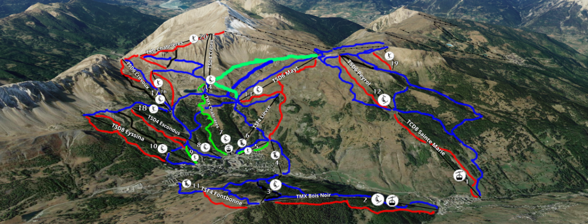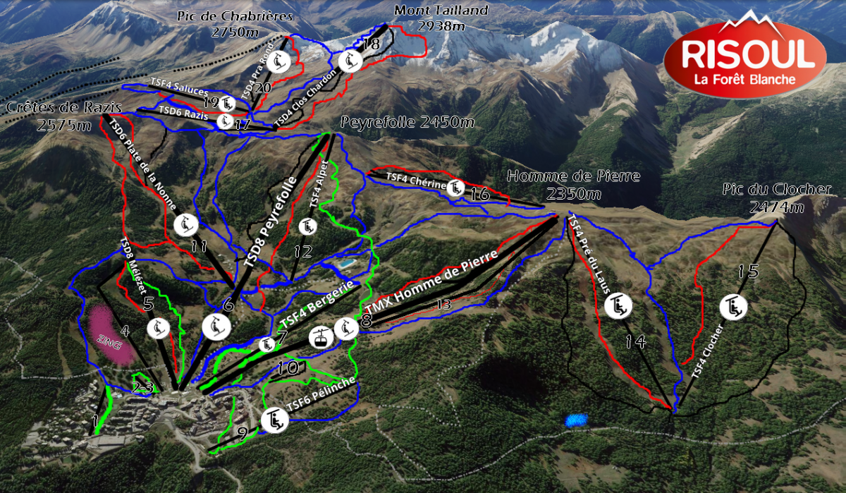 Bienvenue à Risoul, la plus intime des Grandes Stations!! 54 km de pistes de ski alpin, répartis sur 9 pistes vertes, 17 pistes bleues, 9 pistes rouges et 5 pistes noires! 48 km de pistes de ski de fond ✅ Ouvert / ❌ Fermé / 🟧 Mercredi, Samedi, Dimanche Liaisons résidences > Front de neige Gratuit 1 ✅ TKD Orée du Bois (Poma- 900 p/h) 8h50-16h45 Orée du Bois 9 🟧TSF6 Pélinche (Poma - 2600 p/h) 8h40-15h30 Pélinche, Chalp Secteur Chalp - Départ Front de Neige 4 ✅ TKD Mélèzet ⚠️ (Poma - 900 p/h) 9h00-17h00 ZING 5 ✅ TSD8 Mélèzet (Poma - 3900 p/h) 9h00-16h40 Goupil, Serpent, Ecureuil, Sources 6 ✅ TSD8 Peyrefolle Express (Poma - 4000 p/h) 9h00-16h30 Chardons, Vallon Bleu, Coqs, Peyrefolle 7 ✅ TSF4 Bergerie (Leitner- 2000 p/h) 8h50-16h50 Vallon Vert, Plane 8 ✅ TMX8/10 Homme de Pierre🚶♂️(Poma - 3900 p/h) 9h00-16h45 Combe de la Mayt, Côte Belle, Aigles 10 🟧 TKE Surfland (GMM - 500 p/h) 10h00-19h00 TinyPark, Snowpark Espace Débutants Gratuit 2 🟧 TKF Ourson (Poma, 375 pers/h) 9h00-16h50 Ourson 3 ✅ TKD Flocon (GMM, 650 pers/h) 8h50-17h00 Flocon Secteur Chérine - Accès par TMX Homme de Pierre/TSF Bergerie 13 🟧 TKE Homme de Pierre ⚠️ (Leitner - 1100 p/h) 9h10-16h30 Choucas, Homme de Pierre 14 ✅ TSF4 Pré du Laus (LST - 2100 p/h) 9h20-16h30 Clos des Alpes, Lac, Forêt 15 ✅ TSF4 Pic du Clocher (Poma- 1954 p/h) 9h20-16h15 Tétras, Clocher, Chalvet 16 ✅ TSF4 Col de Chérine (Poma - 1700 p/h) 9h10-16h30 Chérine, Crêtes, Adret Secteur Valbelle - Accès par TSD Peyrefolle/TSD Mélézet/TSF Bergerie 11 ✅ TSD6 Plate de la Nonne🚶♂️(Poma - 3000 p/h) 9h15-16h30 Lièvre, Plate, Pinatiaux, Vautour 12 ✅ TSF4 Alpet (Poma - 1900 p/h) 9h20-16h30 Marmottes, Goulet de l'Alpet 17 ✅ TSD6 Valbelle-Razis (MND - 2650 p/h) 9h20-16h45 Florins Secteur Clos Chardons - Accès par TSD Plate/TSD Peyrefolle/TSF Alpet 18 ✅ TSD4 Clos Chardons (Poma - 2100 p/h) 9h20-16h15 Mont Tailland, Clos Chardon, Wild Park 19 ✅ TSF4 Saluces (Poma - 1700 p/h) 9h30-16h30 Saluces, Sablons 20 ✅ TSD4 Pra Rond (Poma - 2100 p/h) 9h30-16h30 Col sans Nom, Pra Rond, Palps Parks: Surfland 🟧 Goulot de la Plate ✅ Goulot de l'Alpet ✅ Forest Park Laus ✅ Itinéraires Piétons/Ski de Fond: Vallon du Mélézet ✅ Chemin du Pré du Lausc✅ Martinat Homme de Pierre ✅ Ronde des Chalps ✅ Lac de Gaudissard ✅ Montée piétonne TS Plate, 🍴Vallon et Tétras ✅ [PROJET VARS] Secteur Sainte Marie 1 TCD8 Sainte Marie (MND - 22000 p/h) Sainte Marie, Olympique Inférieure 2 TMX 6/8 Bois Noir (Doppelmayr- 995 p/h) Mélèzes, Chastradon Secteur Claux 3 TSD4 Peynier (Doppelmayr- 2000 p/h) Peynier, Alpuel 4 TSF6 Plans (Doppelmayr- 2700 p/h) Plans 5 TKE Claux (GMM) Claux 6 TSF4 Lièvre (GMM - 2100 p/h) Cabris, Lièvre 7 TMX 8/10 Chabrières (Doppelmayr- 3900 p/h) Eskimos, Clapier, Marmottes 8 TSD4 Escondus (Doppelmayr - 1800 p/h) 9 TKD Sibières (GMM) 10 TSD8 Eyssina (Doppelmayr - 3500 p/h) 11 TSF4 Fontbonne (GMM - 2100 p/h) Espace Supérieur 11 TSD6 Peyrol (Poma - 1000 p/h) Vallon, Sagne, Olympique Supérieure, Mur du Vallon 12 TSF2 Mayt (GMM - 995 p/h) Serre Bannet, Heureux, Jas du Boeuf 14 TKF Lutins (Poma) Lutins 15 TKD Snow Park (Poma - 950 p/h) Snowpark, Edelweiss 16 TSF3 Col de Crévoux (Poma - 1350 p/h) Col de Crévoux, Barres, Corniche Inférieure, Evasion Liaisons: Risoul > Vars TSD6 Plate, TSD6 Razis, TSF4 Sablons, TSD4 Pra Rond Vars > Risoul TSD6 Peyrol, TSD4 Heureux, TSD4 Chabrières, TK Chabrières ESPACE DEBUTANTS GRATUIT Avec les TK Ourson, Flocons, Orée du Bois! MINI DOMAINE: 17€/JOUR! TK Mélézet / TK Surfland / TSD Mélèzet / TSD Peyrefolle / TS Bergerie SOMMET VERT Plus de 5km de descente en vert avec la piste Chardons accessible par le TCD Peyrefolle 3 HEURES EN BLEU Depuis le front de neige, embarquez sur le TSF4 Bergerie, puis le TKE Homme de Pierre. Empruntez la piste Clos des Alpes, puis le TSF4 Clocher qui vous permet de glisser sur la Tétras. En route sur le TSF4 Pré du Laus, partez à gauche sur la piste Combe de la Mayt, qui vous emmener au pied du TSF4 Alpet. Une fois au sommets, prenez la piste Vallon Bleu, puis Florins pour arriver au TSD Clos Chardons, qui vous permet d'accéder au sommet du domaine skiable! Redescendez avec la piste Mont Tailland, embarquez sur le TSD6 Razis, pour retourner sur le front de neige avec la piste Lièvre. Dernier versant, le TSD8 Mélèzet avec les pistes Serpent ou Ecureuil, avec l'envie de recommencer! Restaurants et bars: Stations: L'Ecureuil: spécialités de montagne et crêperie Snow-Board Café: restauration rapide et crêperie Babao Rhum: bar à rhum Restaurant d'altitude: Le Panoramic: au sommet du TSD Plate L'Homme de Pierre: au sommet du TMX Homme de Pierre Le Vallon: au départ du TSD Peyrefolle Le K2: au départ du TSD Plate Le Valbelle: au départ du TSF Valbelle Razis Hotels: Le Valbelle: ¤¤ Les Chardons: ¤¤ Le Morgan: ¤¤¤ Snow Chill: ¤¤¤¤ Groupe Sara: ¤¤¤¤ Tous les parkings de la station sont gratuits et sécurisés. Les navettes Stations et Stations-Village-Guillestre-Mont Dauphin Gare sont gratuites.
