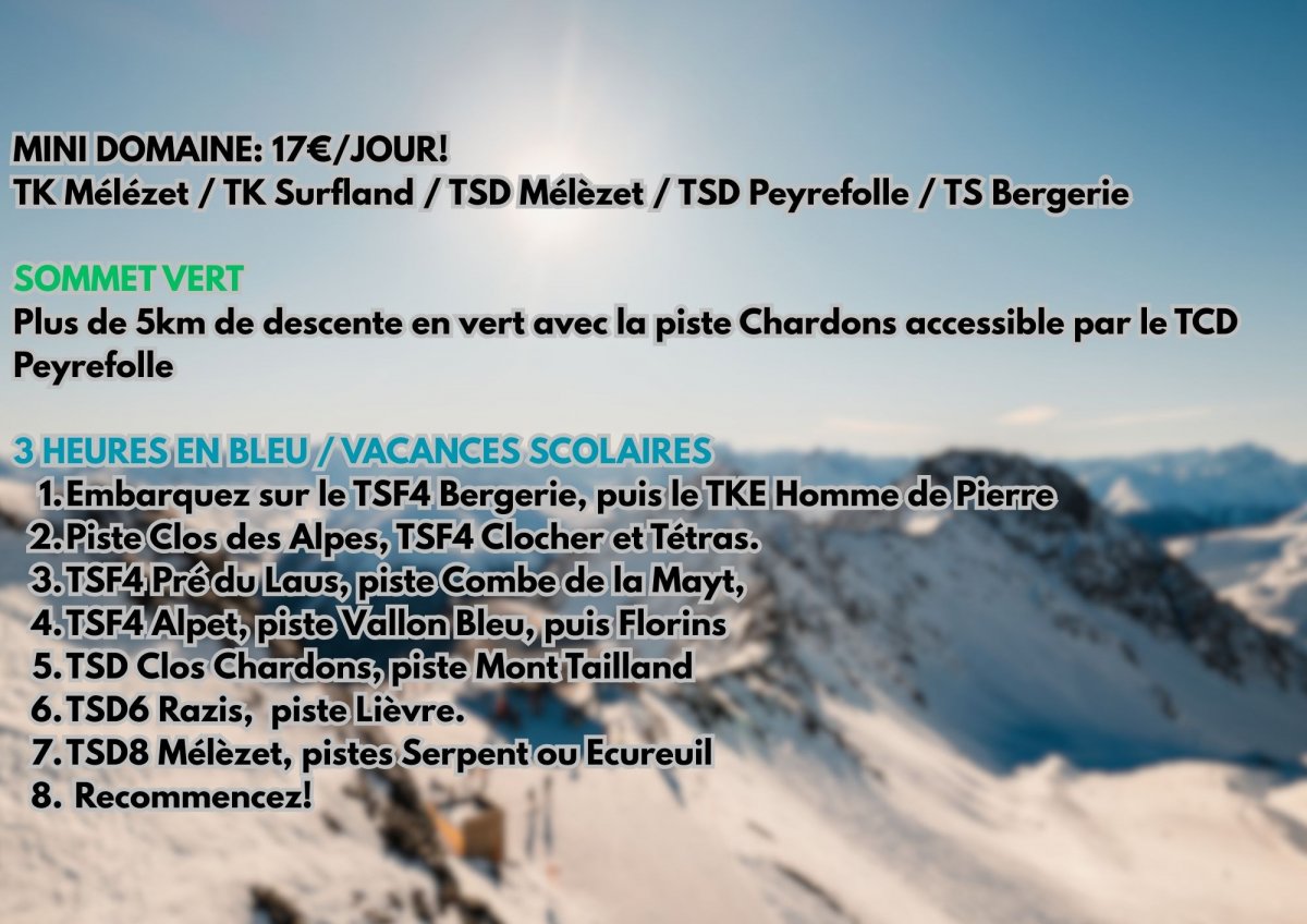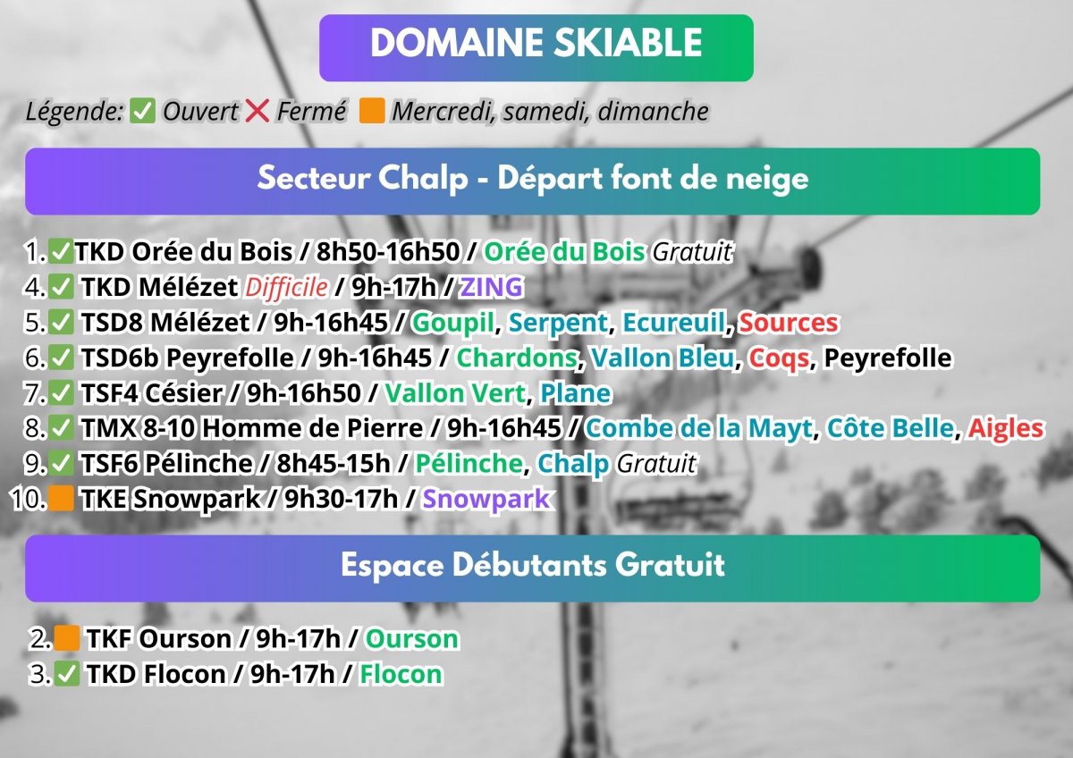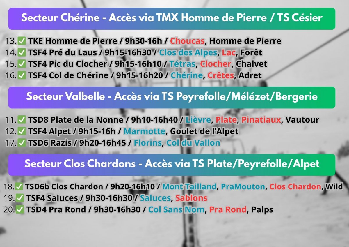 Bienvenue à Risoul, la plus intime des Grandes Stations!! 54 km de pistes de ski alpin, répartis sur 9 pistes vertes, 18 pistes bleues, 9 pistes rouges et 5 pistes noires! 48 km de pistes de ski de fond [PROJET VARS] Secteur Sainte Marie 1 TCD8 Sainte Marie (MND - 22000 p/h) Sainte Marie, Olympique Inférieure 2 TMX 6/8 Bois Noir (Doppelmayr- 2350 p/h) Mélèzes, Chastradon Secteur Claux 3 TSF4 Peynier (GMM - 2400 p/h) Peynier, Alpuel 4 TSF6 Plans (Doppelmayr- 2700 p/h) Plans 5 TKE Claux (Leitner - 1100 p/h) Claux 6 TSF4 Lièvre (GMM - 2000 p/h) Cabris, Lièvre 7 TMX 6/8 Chabrières (Leitner- 2500 p/h) Eskimos, Clapier, Marmottes 8 TSD4 Escondus (Poma - 2100 p/h) ex TSD Clos Chardon 9 TKD Sibières (GMM) 10 TSD8 Eyssina (Doppelmayr - 3500 p/h) 11 TSF4 Fontbonne (GMM - 2100 p/h) Espace Supérieur 11 TSD6 Peyrol (Doppelmayr- 3100 p/h) Vallon, Sagne, Olympique Supérieure, Mur du Vallon 12 TSD6 Mayt (Doppelmayr - 3100 p/h) Serre Bannet, Heureux, Jas du Boeuf 14 TKF Lutins (Poma) Lutins 15 TKD Snow Park (Poma - 950 p/h) Snowpark, Edelweiss 16 TSF6 Col de Crévoux (Poma - 1350 p/h) Col de Crévoux, Barres, Corniche Inférieure, Evasion PROJETS ETE 2026: Elargissement des pistes Col sans Nom, Ecureuil, Mont Tailland, Marmottes, Clos Chardon Début des chantiers pour Vars: TK Claux, TSF4 Lièvre, TSD4 Escondus (ex TSD Clos Chardon), TCD4 Sainte Marie, TSF2 Peyrol