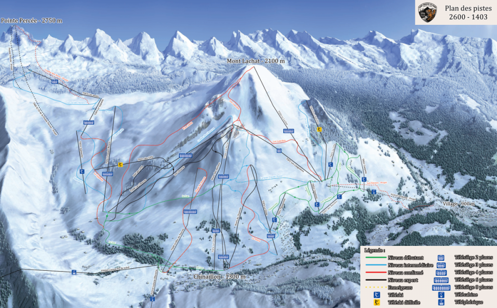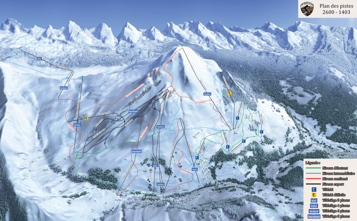 [temporaire] 22 pistes : 6 vertes, 7 bleues, 5 rouges, 4 noires 17 remontées mécaniques 2 liaisons offrant 70,51 km de pistes directement accessibles